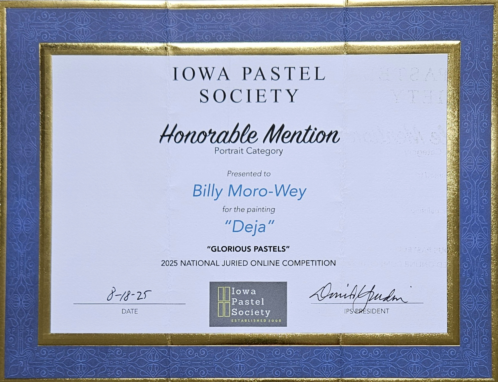 “Glorious Pastels” – Iowa Paste Society, Amana Colonies, IA 2025. Award – Honorable Mention and Gift Card. Portrait Category titled – Deja.